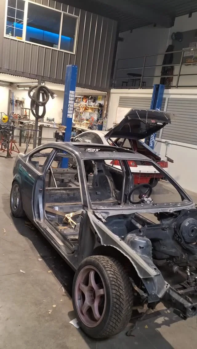 A car in a garage with a metal roll cage frame installed inside, shelf with tools and parts in the background
